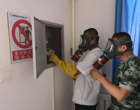 演練中,值班人員發(fā)現(xiàn)危險(xiǎn)化學(xué)品泄漏后馬上報(bào)告給部門領(lǐng)導(dǎo),并立即啟動(dòng)哈密水務(wù)公司二氧化氯泄漏應(yīng)急處置預(yù)案,迅速組織人員按照預(yù)案處置程序采取措施:公司維修人員根據(jù)指令全部穿戴好防毒護(hù)具,做好停電措施并關(guān)閉加藥設(shè)備、開啟通風(fēng)設(shè)施進(jìn)行搶修,同時(shí)對泄漏地面的藥品進(jìn)行稀釋沖洗,整個(gè)處置過程緊密配合、銜接有序。