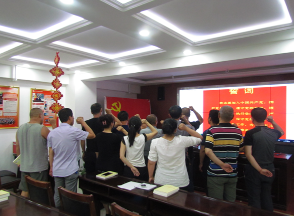 學(xué)習(xí)結(jié)束后,全體黨員面對(duì)黨旗,由黨總支書(shū)記謝利民領(lǐng)誓重溫入黨誓詞。
