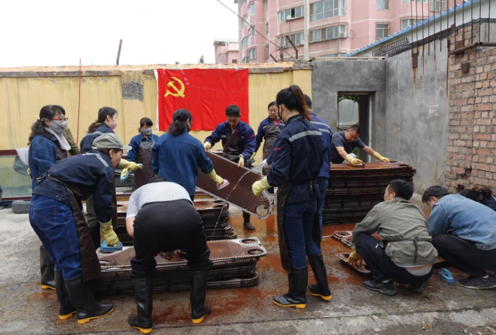 活動開始,公司黨員干部職工在技術人員指導下,統(tǒng)一佩戴好勞動防護用具,投入到緊張有序的清洗板換工作中,大家不怕臟、不怕累,認真仔細清洗板換。通過此次活動,提高了大家的凝聚力和愛廠如家的思想意識,充分發(fā)揮吃苦在前、享受在后的黨員先鋒模范作用和黨支部戰(zhàn)斗堡壘作用。