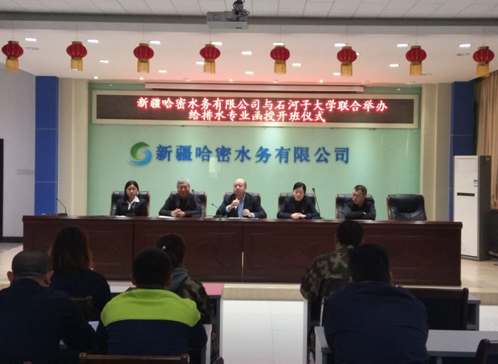 2019年11月8日,新疆哈密水務(wù)有限公司與石河子大學(xué)聯(lián)合舉辦給排水函授專業(yè),2019級(jí)全體新生在公司六樓會(huì)議室舉行了隆重的開班儀式。新疆哈密水務(wù)有限公司班子成員、哈密職業(yè)技術(shù)學(xué)院院長(zhǎng)助理鄭金林、哈密職業(yè)技術(shù)學(xué)院繼續(xù)教育中心副主任胡慧霞出席了開班儀式,哈密水務(wù)黨總支副書記王芳主持。